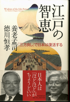 養老孟司氏と徳川恒孝氏の対談集『江戸の智恵~ 「三方良し」で日本は復活する』(PHP研究所)を読んだ。 「売り手良し」「買い手良し」「世間良し」の三つの「良し」が 「三方良し」だが、近江商人の商売哲学といわれたこの考え方は、 江戸時代にぴたりと当てはまるらしい。 帯に「日本人には<ほどほど>がちょうどいい」とあるが、 これは今の日本と世界に当てはまる考え方である。 ビッガー・イズ・ベターのアメリカ式大量主義から 日本や東洋のほどほどサイズ主義の時代への パラダイム転換期が今である。 養老孟司氏の説明はもはや不要であろう。 徳川恒孝氏はなんと徳川宗家十八代目当主であり、 世が世ならば、「将軍様」「お殿様」である。 なるほど悠然としたお殿様然とした発言が随所に見られるが、 その指摘するところは的を射ていて、 教養とはこういうものかと納得させられる。 「江戸の智恵」とは一言で言えば「持たずの暮らし」だろう。 際限のない物質主義の踊らされてきた日本人も、 ここへ来て、待てよ何かおかしいぞ、と気づき始めた。 そして行き着いたのが「江戸の智恵」である。 ほどほどで十分ではないか、物を持ちすぎると不幸になる。